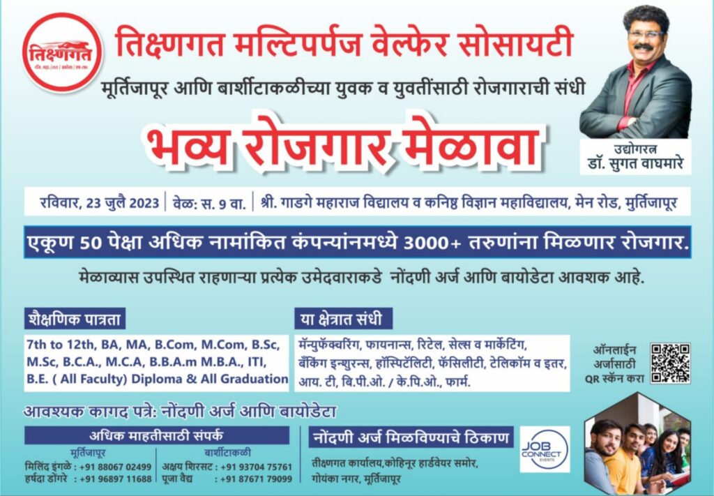 स्थानिक : अकोला जिल्ह्यातील मूर्तिजापूर आणि बार्शीटाकळी येथील तरुणांसाठी आनंदाची बातमी, तिक्ष्णगत मल्टिपर्पज वेल्फेअर सोसायटी तर्फे येत्या २३ जुलै रोजी सकाळी ९:०० वाजता मुर्तिजापूर येथील श्री. गाडगे महाराज विद्यालय व कनिष्ठ विज्ञान महाविद्यालय, मेन रोड, मुर्तिजापूर येथे भव्य रोजगार मेळाव्याचे आयोजन करण्यात आले आहे.