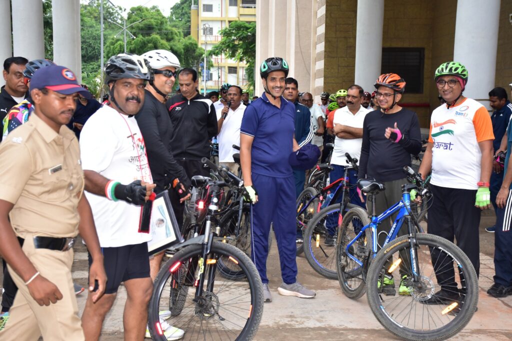 आज दिनांक १६/०८/२०२३ रोजी अकोला जिल्हा पोलीस दला तर्फे स्वातंत्र्याच्या अमृत महोत्सवानिमित्त मेरी माटी मेरा देश या उपक्रमाअंतर्गत वाहतुकीच्या नियमांची जनजागृती करिता स्वातंत्र्याची अमृत महोत्सवी सायकल रॅलीचे चे आयोजन करण्यात आले होते मा.अजित कुंभार जिल्हाधिकारी अकोला यांच्या प्रमुख उपस्थिती मध्ये मा.श्री. पोलीस अधीक्षक संदीप घुगे यांच्या मार्गदर्शनाखाली,पोलीस अधीक्षक कार्यालय अकोला येथून सकाळी सात वाजता रॅलीला मा.श्री.अजित कुंभार जिल्हाधिकारी अकोला यांनी हिरवी झेंडी दाखवुन सुरुवात केली. सायकल रॅली पोलीस अधीक्षक कार्यालय, लक्झरी बस स्टँड, सरकारी बगीचा, सिटी कोतवाली, तिलक रोड, अकोट स्टँड, रेल्वे स्टेशन, अग्रसेन चौक, दुर्गा चौक, रतनलाल प्लॉट चौक, सिव्हिल लाईन, चौक नेहरू पार्क, रामलता बिझनेस सेंटर , इन्कम टॅक्स चौक, तुकाराम चौक, तुकाराम चौक मार्गे पुन्हा नेहरू पार्क, हुतात्मा चौक, मार्गस्त होऊन, वाहतूक नियम या विषयावर जनजागृती पर पोस्टर लावून तसेच ऑडिओ सिस्टम द्वारे वाहतुकीचे नियमा बाबत माहिती देण्यात आली तसेच वाहतुकीचे नियम याबद्दल पोस्टर लावण्यात आले होते. रॅली समारोप पोलीस अधीक्षक कार्यालय येथे झाला,मा.श्री.अजित कुंभार जिल्हाधिकारी अकोला यांनी शुभेच्छा दिल्या व लवकरच फिट अकोला हा उपक्रम जिल्हा पातळीवर सुरु करण्यात येईल असे आपले मत व्यक्त केले, मा.श्री संदिप घुगे पोलीस अधीक्षक यांनी रॅली मध्ये सहभागी सर्वांचे आभार मानले.