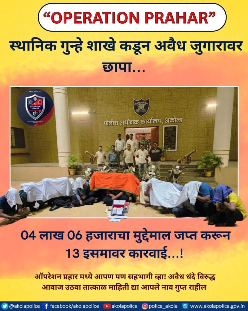 “ऑपरेशन प्रहार” अंतर्गत अशा अवैध जुगार अड्ड्यांवर पोलिसांची कडक नजर असून, यापुढील काळातही अशा कारवाया सातत्याने सुरू राहतील, असा इशारा पोलिसांकडून देण्यात आला आहे.
