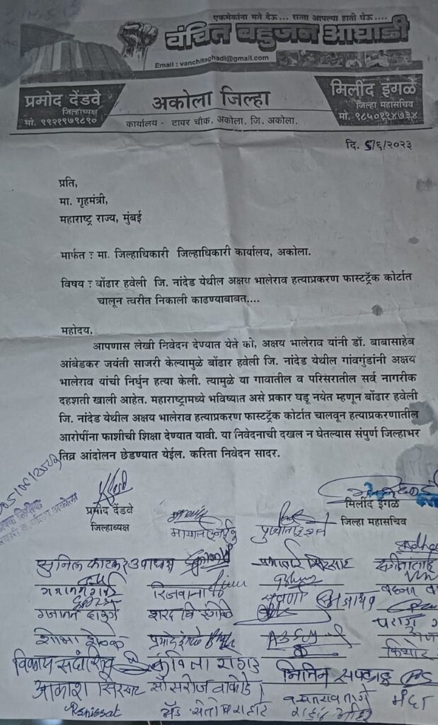 राज्याचे गृहमंत्री यांना मागणी केलेल्या निवेदनात वंचित बहुजन आघाडीच्या वतीने असे म्हटले आहे की, अक्षय भालेराव यांनी भारतरत्न डॉ बाबासाहेब आंबेडकर यांची जयंती साजरी केल्यामुळे बोंढार हवेली जि. नांदेड येथील गावगुंडांनी अक्षय भालेराव यांची निर्घृण हत्या केली. त्यामुळे या गावातील व परिसरातील सर्व नागरिक दहशतीखाली वावरत आहेत. महाराष्ट्रामध्ये भविष्यात असे प्रकार घडू नयेत म्हणून बोंढार हवेली जि. नांदेड येथील अक्षय भालेराव यांच्या हत्याप्रकरण हे फास्टटॅक कोर्टामार्फत त्वरीत कारवाई करून प्रकरण निकाली काढण्यात यावे व या हत्याकांडात दोषी आरोपींना फाशीची शिक्षा देण्यात यावी. आणि या निवेदनाची दखल शासनाने न घेतल्यास संपूर्ण जिल्हाभर आंदोलन छेडण्याचा इशाराही निवेदनातून देण्यात आला आहे.