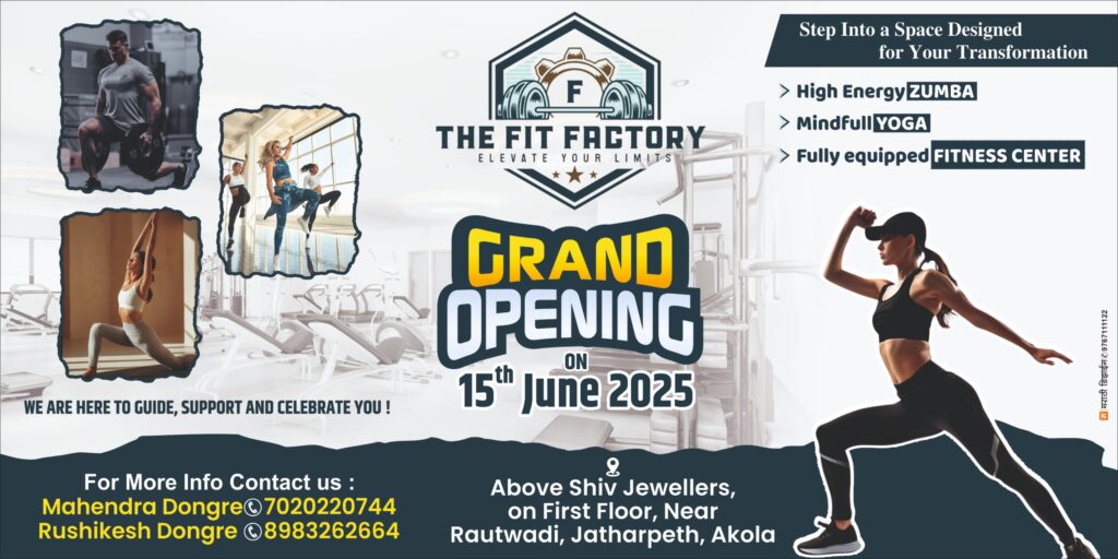 अकोल्यातील तरुणांना आरोग्यदायी जीवनशैलीकडे वळवण्यासाठी आणि फिटनेसची संस्कृती रुजवण्यासाठी श्री महेंद्र डोंगरे यांच्या संकल्पनेतून साकारलेली ‘दि फिट फॅक्टरी’ जीम येत्या १५ जून २०२५ रोजी दुपारी १२ वाजता राऊतवाडी, जठारपेठ येथील शिव ज्वेलर्सच्या वरच्या मजल्यावर अकोल्यात प्रथमच सुरू होत आहे.