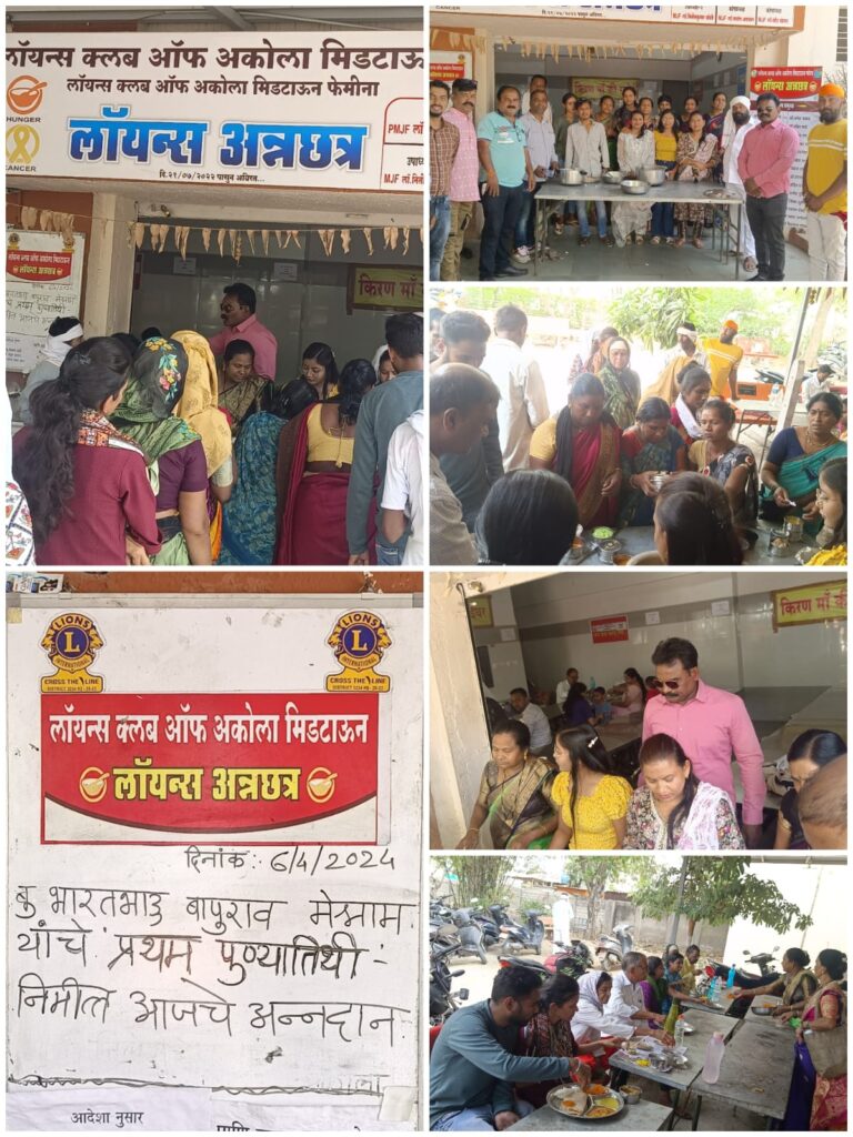 स्थानिक : अकोला येथील लॉयन्स क्लब ऑफ अकोला मिडटाऊन गोल्ड द्वारा सुरू असणाऱ्या लॉयन्स अन्नछत्र या उपक्रमात कॅन्सर ग्रस्त रुग्णांच्या सेवेकरिता संत तुकाराम कॅन्सर हॉस्पिटल अकोला आणि मोठी उमरी आनंद आश्रम येथे अनाथ मुलांना दिवंगत भारत मेश्राम यांच्या प्रथम पुण्यतिथी निमित्ताने प्रबुद्ध भारत बहुउद्देशीय संस्था अकोला आणि नातेवाईक यांच्या कडून भोजनदान करण्यात आले.