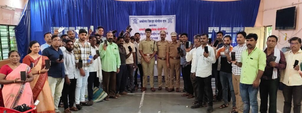 अकोला:मा. श्री बच्चनसिह, पोलीस अधिक्षक साहेब, जिल्हा अकोला, मा. अभय डोंगरे अपर पोलीस अधिक्षक साहेब जिल्हा अकोला यांचे मार्गदर्शनात नागरीक प्राथमीक पोलीसींग अभियान राबवुन पोलीस स्टेशन अकोट शहर ११ मोबाईल, अकोट ग्रामीण ०९ मोबाईल, तेल्हारा ०८ मोबाईल,, हिवरखेड ०३ मोबाईल, दहिहांडा ०५ मोबाईल असा एकुण ३६ मोबाईल चा शोध घेवुन ४,९३,९०० रूपयाचा मुद्देमाल हस्तगत करून मोबाईल धारकांना बोलावुन पोलीस स्टेशन अकोट शहर येथे सावली सभागृह ला हरविलेले मोबाईल परत करण्याचा कार्याक्रम घेण्यात आला असुन सदर कार्याक्रमामधे श्री अनमोल मित्तल सहा. पोलीस अधिक्षक उपविभागीय पोलीस अधिकारी अकोट, अमोल माळवे पोलीस निरीक्षक पोलीस स्टेशन अकोट शहर, किशोर जुनघरे पोलीस निरीक्षक पोलीस स्टेशन अकोट ग्रामीण यांचे हस्ते मोबाईल धारकांना मोबाईल परत करण्यात आले. हजर असलेल्या ३६ मोबाईल धारकांनी हरविलेला मोबाईल परत मिळाल्याचा आनंद व्यक्त करून पोलीस विभागाचे आभार मानले. सदर कार्यक्रमा करीता गणेश पाचपोर पोउपनिरीक्षक उपविभागीय पोलीस अधिकारी कार्यालय अकोट, पोलीस अंमलदार नंदकिशोर कुलट, प्रदीप राउत, गोपाल जाधव, प्रमोद चव्हाण, योगेश उमक, रामेश्वर भगत, अनिल सिरसाट, गणेश धुर्वे यांनी अथक परिश्रम घेतले. अनमोल मित्तल सहा. पोलीस अधिक्षक उपविभागीय पोलीस अधिकारी अकोट, यांनी जनतेला असे ही आवाहन केले की, महीलांवर होते असलेल्या अत्याचारा बाबत सक्षम कार्यक्रम राबवित असुन कोणालाही काही अडचण असल्यास डायल ११२ चा वापर करावा.