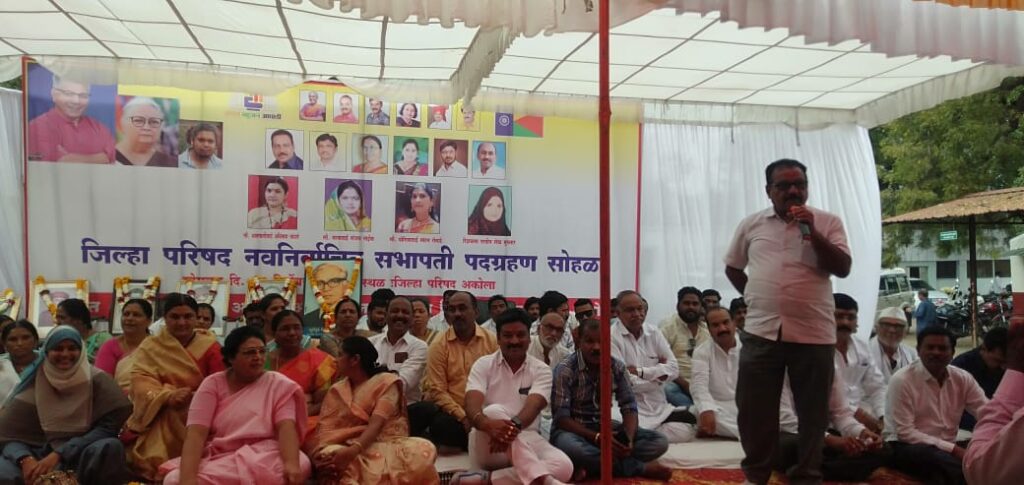 वंचित बहुजन आघाडीची सत्ता असलेल्या अकोला जिल्हा परिषदेच्या चार नवनिर्वाचित जिल्हा परिषद सभापतींचा आज दि. १२/१२/२०२२ रोजी दुपारी १२:३० वाजता स्थानिक जिल्हा परिषद येथे वंचित बहुजन आघाडीचे जिल्हाध्यक्ष प्रमोदभाऊ देंडवे यांच्या अध्यक्षतेखाली पदग्रहण सोहळा संपन्न झाला. या पदग्रहण सोहळ्याला वंचित बहुजन आघाडीचे युवा प्रदेश महासचिव राजेंद्र पातोडे, महिला प्रदेश महासचिव सौ. अरूंधतीताई शिरसाट, जिल्हा महासचिव मिलिंदभाऊ इंगळे, महिला जिल्हाध्यक्ष सौ. प्रभाताई शिरसाट, जि. प. अध्यक्ष सौ संगीताताई अढावू, जि. प. उपाध्यक्ष सुनिल फाटकर, माजी जि. प. अध्यक्ष तथा जि. प. सदस्य सौ. पुष्पाताई इंगळे, गटनेते ज्ञानेश्वर सुलताने, महिला जिल्हा महासचिव सौ. शोभाताई शेळके, जेष्ठ नेते मनोहरराव पंजवाणी, बळीरामजी चिकटे, अशोकराव शिरसाट, प्रतिभाताई अवचार, महानगर अध्यक्ष सौ वंदनाताई वासनिक, महिला जिल्हा महासचिव निलोफर शहा, माजी सभापती आकाश शिरसाट, राहुलजी अहिरे, महानगर अध्यक्ष कलिम खॉ. पठाण, किशोर जामणिक, नितेश किर्तक, संजय हिवराळे, अमोल शिरसाट, अमोल जामणिक, निताताई गवई, प्रमोदिनी कोल्हे, लिनाताई शेगोकार, राम गव्हाणकर, शंकरराव इंगळे, मोहन तायडे, रतन आडे, चरण इंगळे, देवराव राणे, सुनिल सरदार, राजेश वावकार, अजय शेगावकर, वसंतराव नागे, सुशील मोहोळ यांच्यासह सर्व जि. प. सदस्य, पंचायत समिती पदाधिकारी व तालुकाध्यक्ष मंचावर उपस्थित होते.