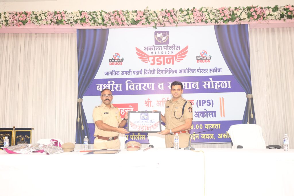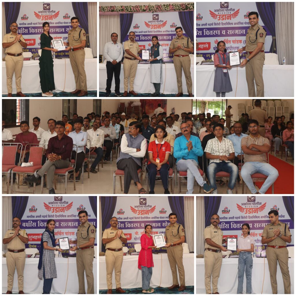 अकोला(प्रतिनिधी)— अकोला जिल्हा पोलीस दलाच्या वतीने ‘मिशन उडान’ उपक्रमांतर्गत अमली पदार्थ विरोधी जनजागृतीसाठी आयोजित करण्यात आलेल्या “अमली पदार्थ – मृत्युचा मार्ग” या विषयावरील पोस्टर स्पर्धेतील विजेत्यांचा गौरव समारंभ मंगळवारी पोलीस लॉन, अकोला येथे मोठ्या उत्साहात पार पडला. या कार्यक्रमाचे अध्यक्षस्थान पोलीस अधीक्षक श्री. अर्चित चांडक यांनी भूषवले.